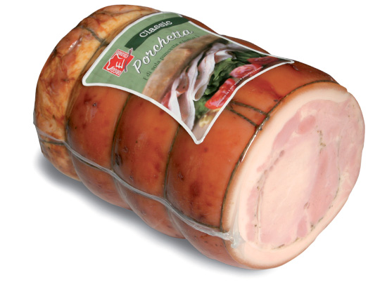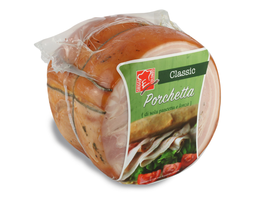 Trancio di porchetta a base di pancetta e lonza suina. La cottura al forno dona un aspetto dorato esternamente, con una carne morbida e succosa all’interno. Ideale se accompagnata da patate al forno ed anche per farcire panini o tramezzini.