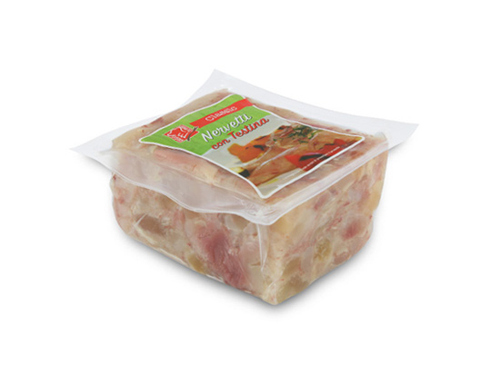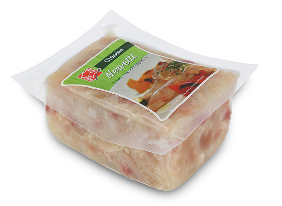 Per chi è alla ricerca di sapori ancor più ricchi, ai nervetti viene aggiunta la testina bovina, lessata separatamente per lungo tempo come da antica tradizione. Il risultato è un prodotto la cui unicità viene esaltata dal profumo e dalla morbidezza di questi ingredienti. Anch’essi confezionati sottovuoto nella tipica forma a mattonella, sono pronti da tagliare a striscioline e condire a piacimento.