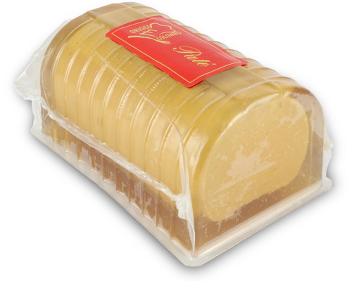 In gastronomia il termine paté indica un pasticcio di carne, mescolato con odori e vini liquorosi. Il nostro paté nel rispetto della tradizione, viene preparato con carne bovina, brandy, marsala, zucchero, burro e spezie. Contornato da gelatina e sagomato nella nostra esclusiva vaschetta a forma di bauletto, il prodotto si può assaporare freddo, affettato sottilmente oppure spalmabile. Una elegante etichetta di colore rosso e oro, impreziosisce la confezione sottovuoto. Disponibile nella pezzatura da 1,700 kg.